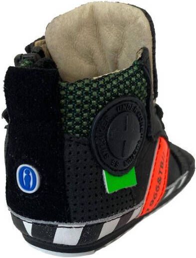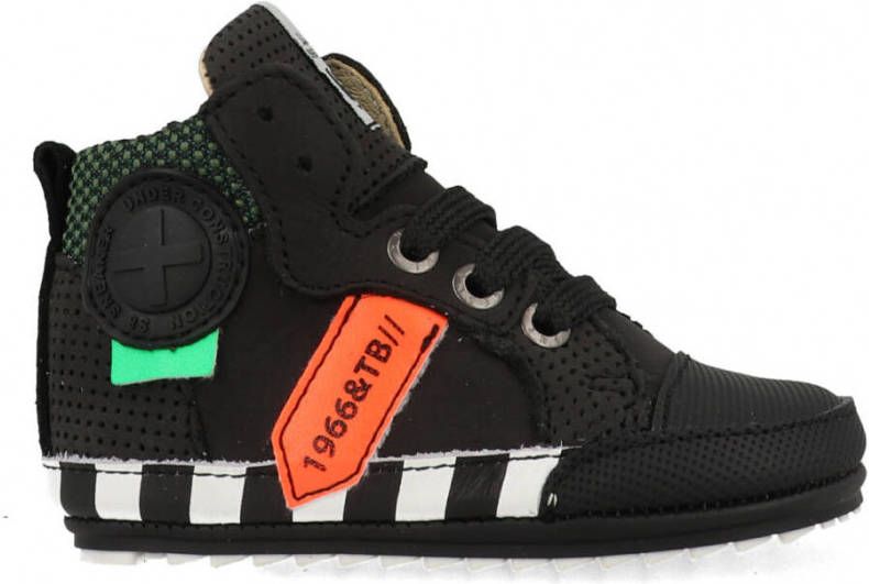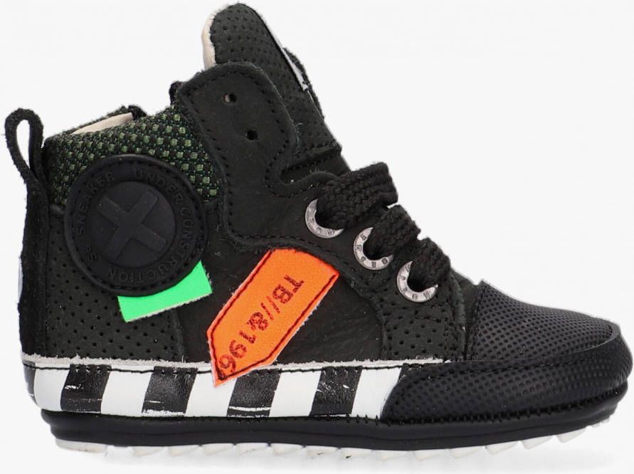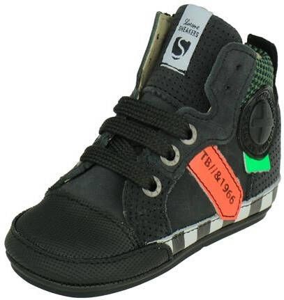 Zwarte Shoesme Veterschoenen Babyproof Flex. Stoer, licht en buigzaam babyproof schoentje van ShoesMe, speciaal ontwikkeld voor de eerste stapjes. Uitgevoerd in een combinatie van leer met rubber met kleurrijke accenten en een patch op de buitenzijde Het hoge model zorgt voor extra stevigheid aan de enkels, is volledig leer gevoerd en heeft een uitneembaar voetbed wat erg fijn is om te controleren of de voetjes nog voldoende groei- en bewegingsruimte hebben. Met een veter / rits combinatie goed passend te maken aan het voetje, maar ook makkelijk en snel aan en uit te trekken.De flexibele antislipzool heeft een goede grip en buigt mee met de voetjes waardoor de voetjes bij ieder stapje goed kunnen afwikkelen.
