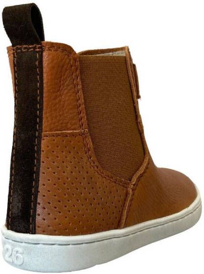Bruine Shoesme Laarsjes Urban Cognac. Dit laarsje uit de Shoesme collectie is uitgevoerd in cognackleurig leer, volledig leder gevoerd en heeft een uitneembaar voetbed. Sluit middels een ritssluiting aan de binnenzijde en heeft op de buitenzijde een elastische inzet voor extra ruimte en gemak bij het instappen. De hiel heeft een perforatie detail en is gesierd met een donkerbruine band met aantreklus. Dit Shoesme laarsje staat op een stevige en slijtvaste rubber zool.